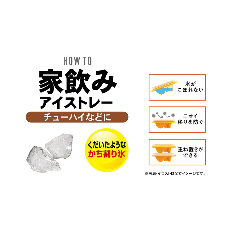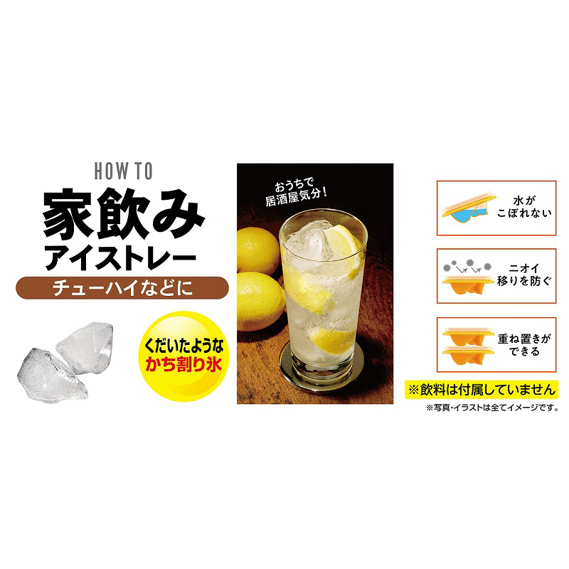 ピックでくだいたようなかち割り氷が作れるアイストレー。一度に10個の氷が作れる。チューハイやハイボール等にご使用頂くと居酒屋気分が味わえる。JIS基準水漏れ試験適合の密閉フタ付きでニオイ移りも防ぐ。重ね置きも可能。