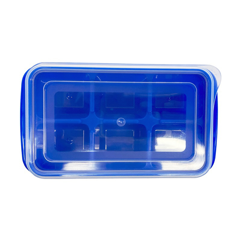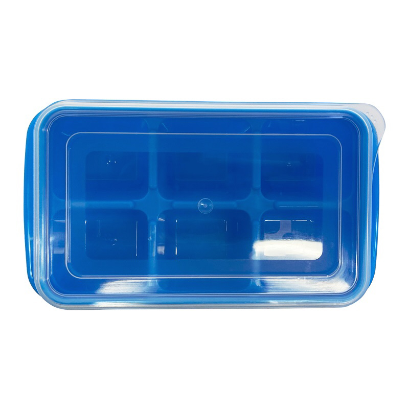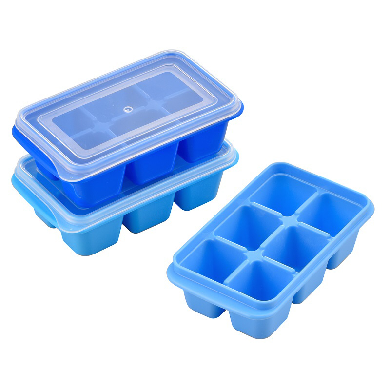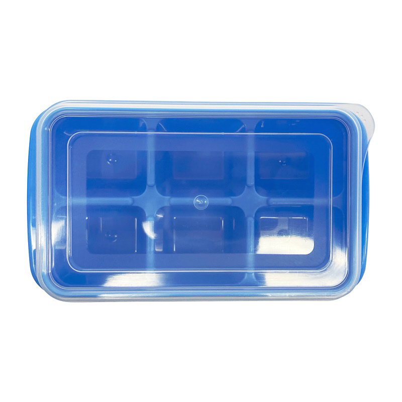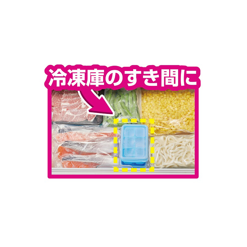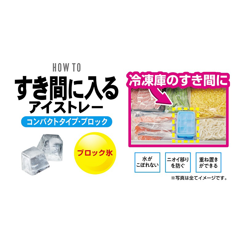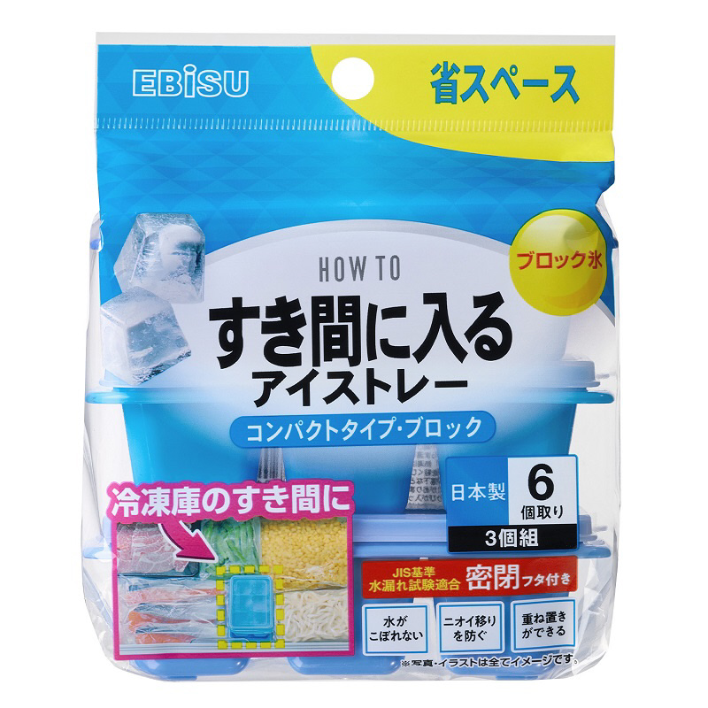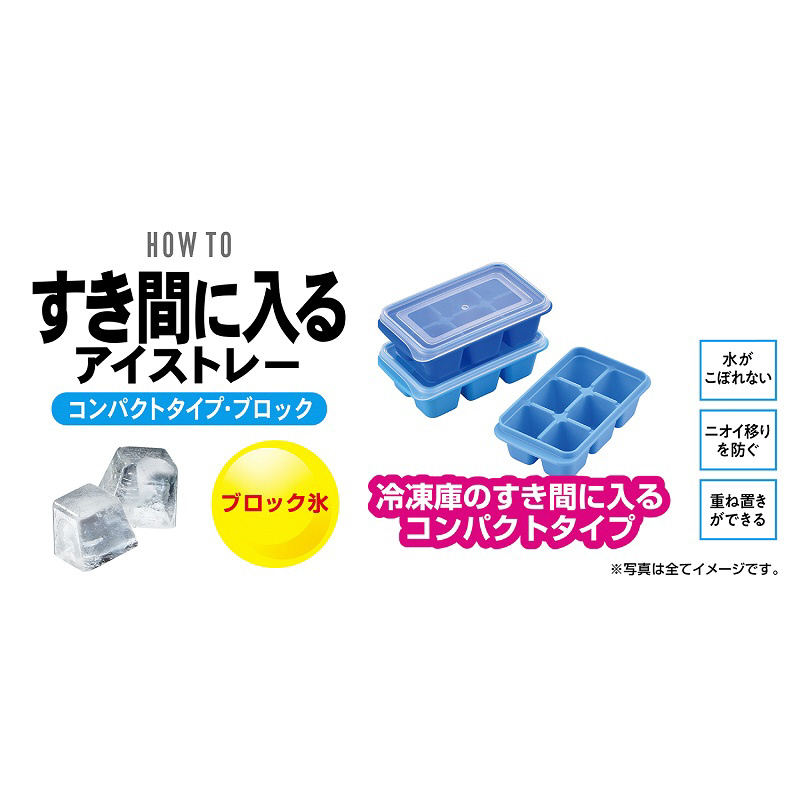 冷凍庫のすき間に重ねて置けて省スペースでブロック氷が作れるアイストレー。一度に6個の氷が作れる3個組(合計18個)。使わない時はコンパクト収納が可能。JIS基準水漏れ試験適合の密閉フタ付きでニオイ移りも防ぐ。