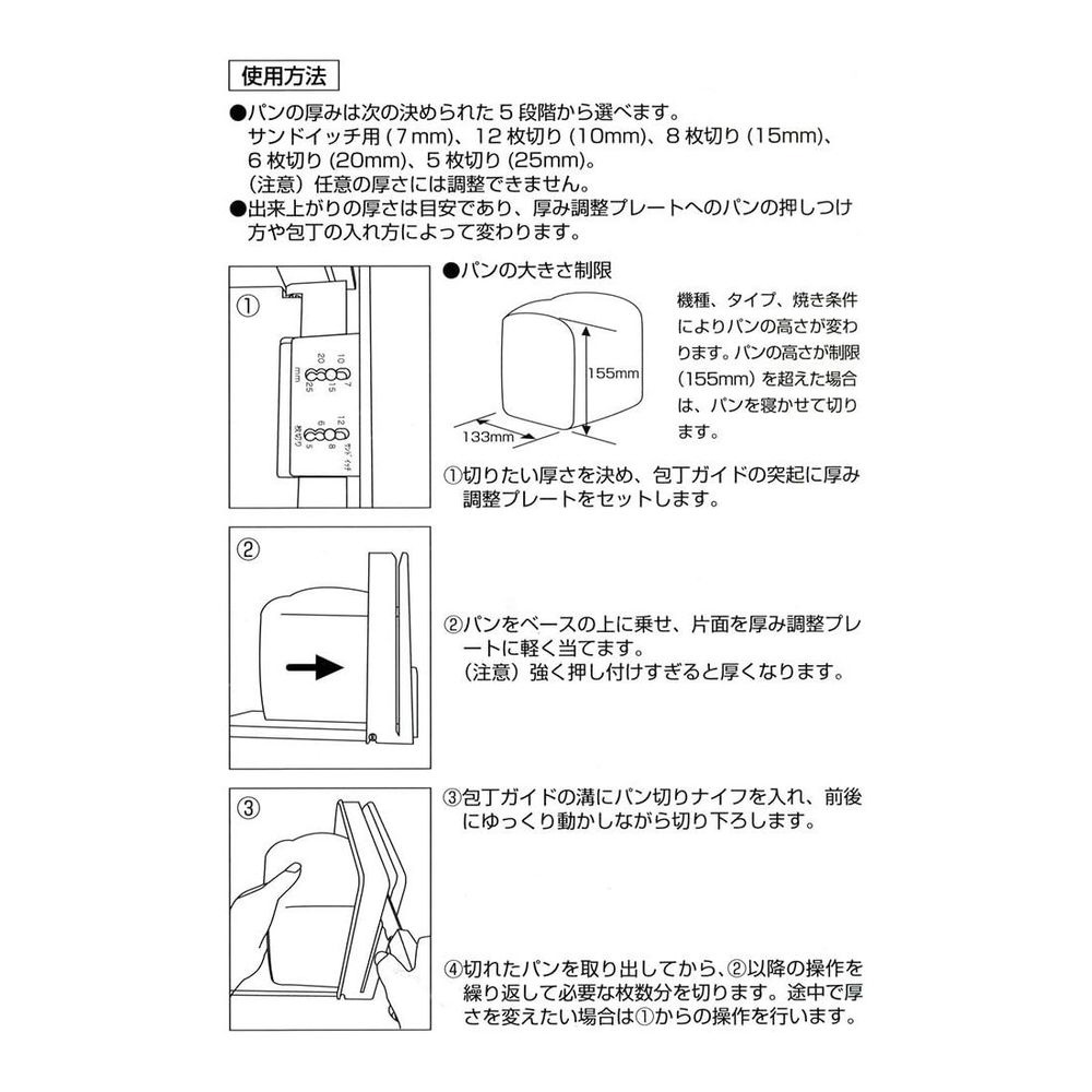 【仕様】耐熱温度: 厚み調整プレート・包丁ガイド・ベース/80℃、すべり止め/90℃●セット内容: 厚み調節プレート、包丁ガイド・ベース●厚さ: サンドイッチ用(7mm)、12枚切(10mm)、8枚切(15mm)、6枚切(20mm)、5枚切(25mm)