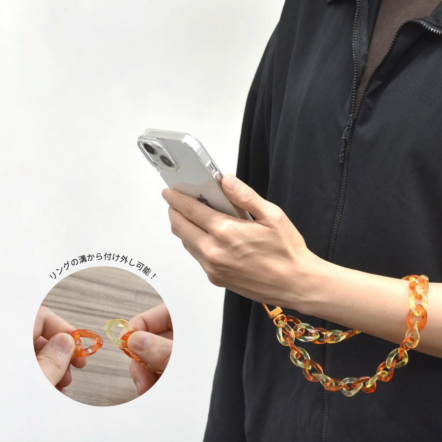 リングパーツの溝部分で長さの調整ができ、短くすることでハンドストラップとしてもお使いいただけます。