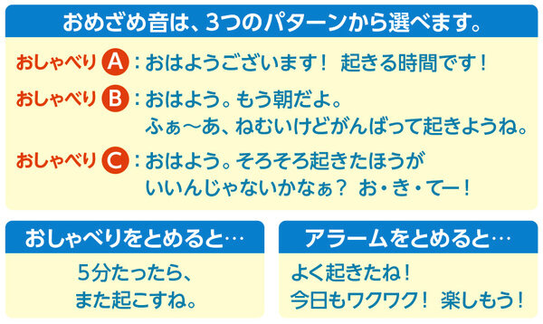 おしゃべりB:おはよう。もう朝だよ。ふぁ〜あ、ねむいけどがんばって起きようね。