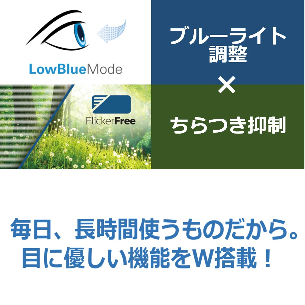 眼精疲労につながるブルーライト/ちらつきを低減する機能を搭載。
