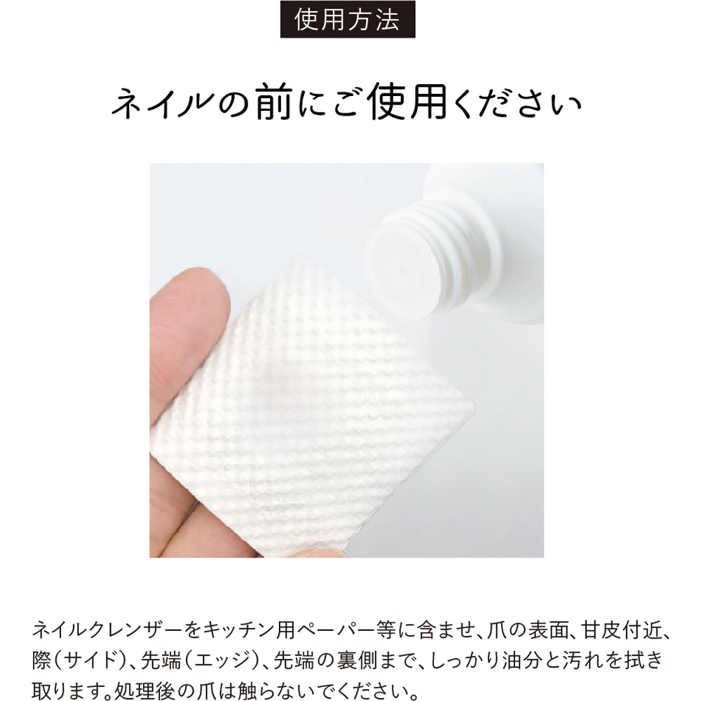 キッチン用ペーパー等に適量を含ませ爪表面、甘皮付近、際(サイド)、先端(エッジ)、先端の裏側までしっかりと油分と汚れを拭き取ります。