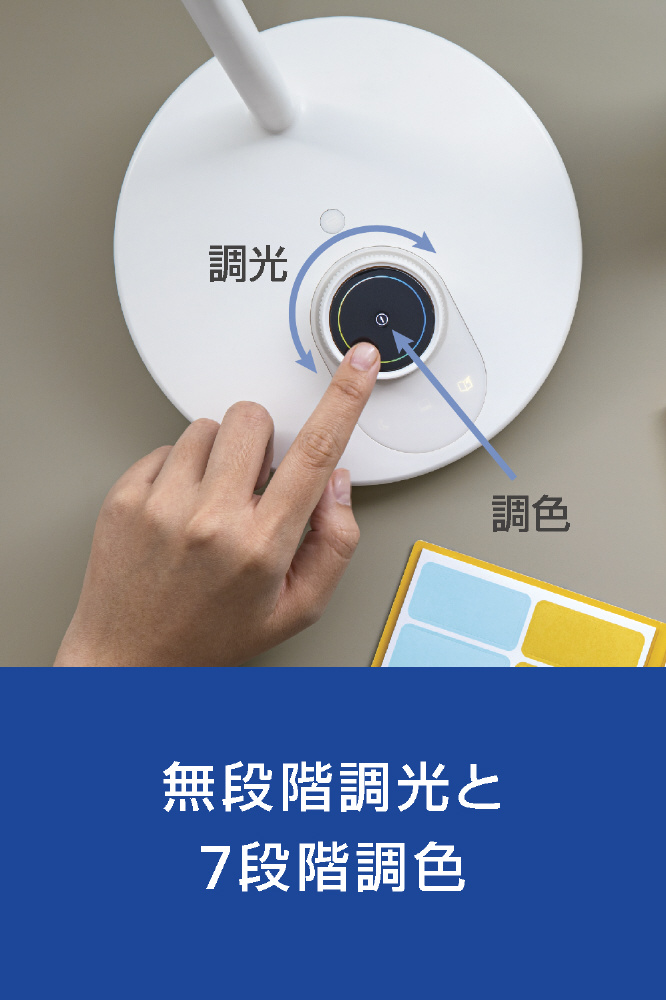 スクロールボタンによるシームレスな無段階調光。タッチパネルで色温度(2700K〜6500K)の設定が可能。