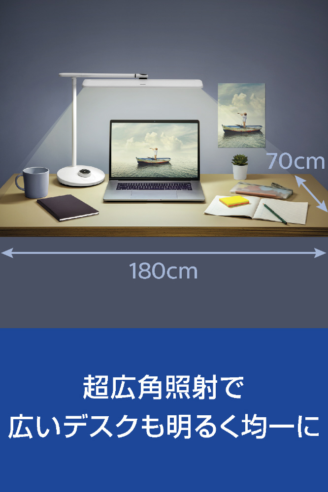 机上に180 x 70cmの均一な光による広角照射を実現。手元だけでなく、机上いっぱいに広がる均一の光は長時間集中して作業するのに役立ちます。