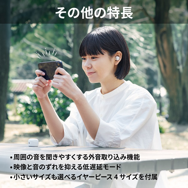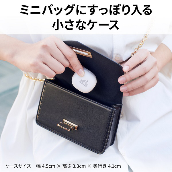 イヤホン本体と充電ケースのデザイン見直しを実施。約4.5g(片耳)で軽やかな装着感の小型・軽量ボディを実現しました。充電ケースもミニバッグに収まるコンパクトサイズで気軽に持ち運ぶことができます。