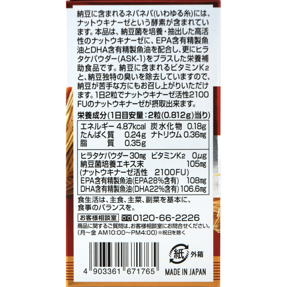 本品は、納豆菌を培養・抽出した高活性の納豆キナーゼに、EPA含有精製魚油とDHA含有精製魚油を配合し、更にヒラタケパウダー(ASK-1)をプラスした栄養補助食品です。