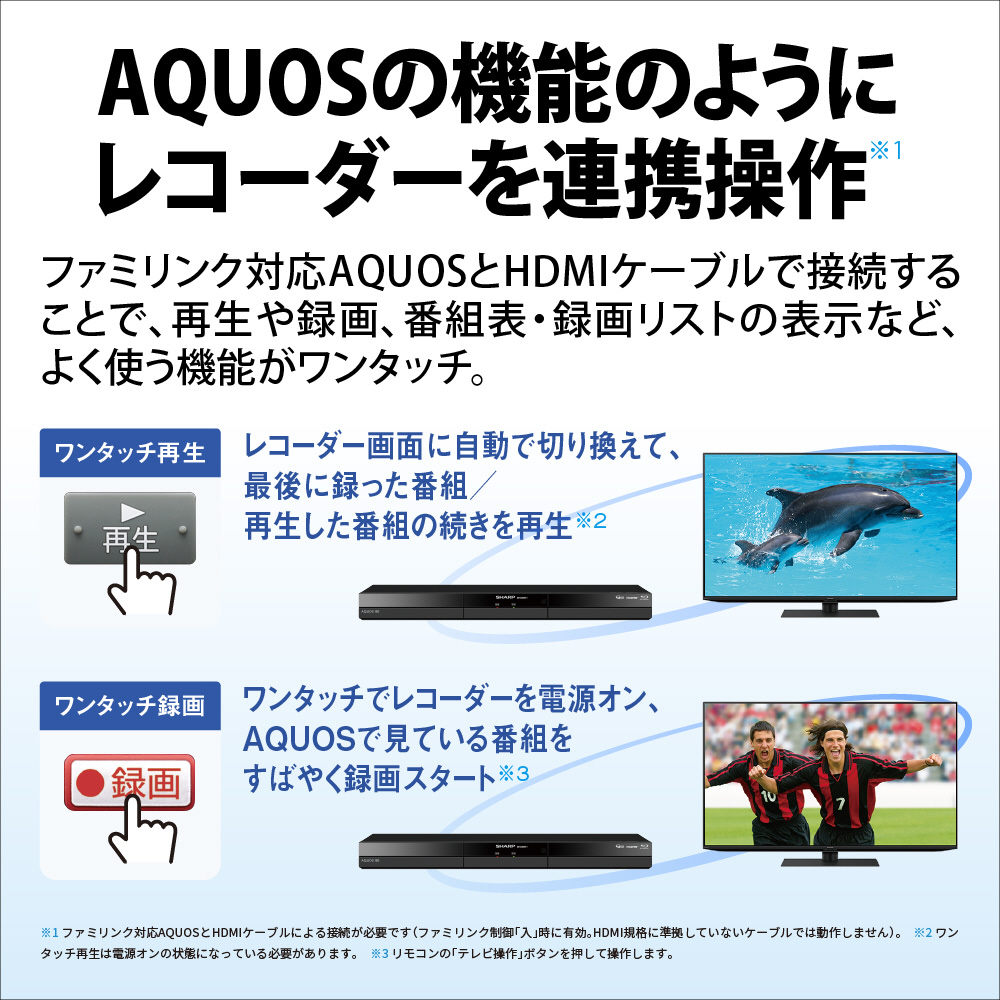 ※1 ファミリンク対応AQUOSとHDMIケーブルによる接続が必要です(ファミリンク制御「入」時に有効。HDMI規格に準拠していないケーブルでは動作しません)。