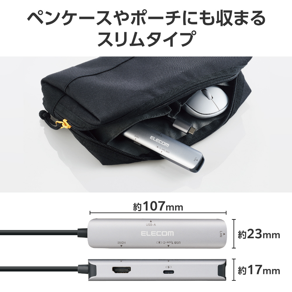 ペンケースやガジェットポーチにも収まるスリムタイプ。軽量で放熱性に優れたアルミ筐体を使用しています。