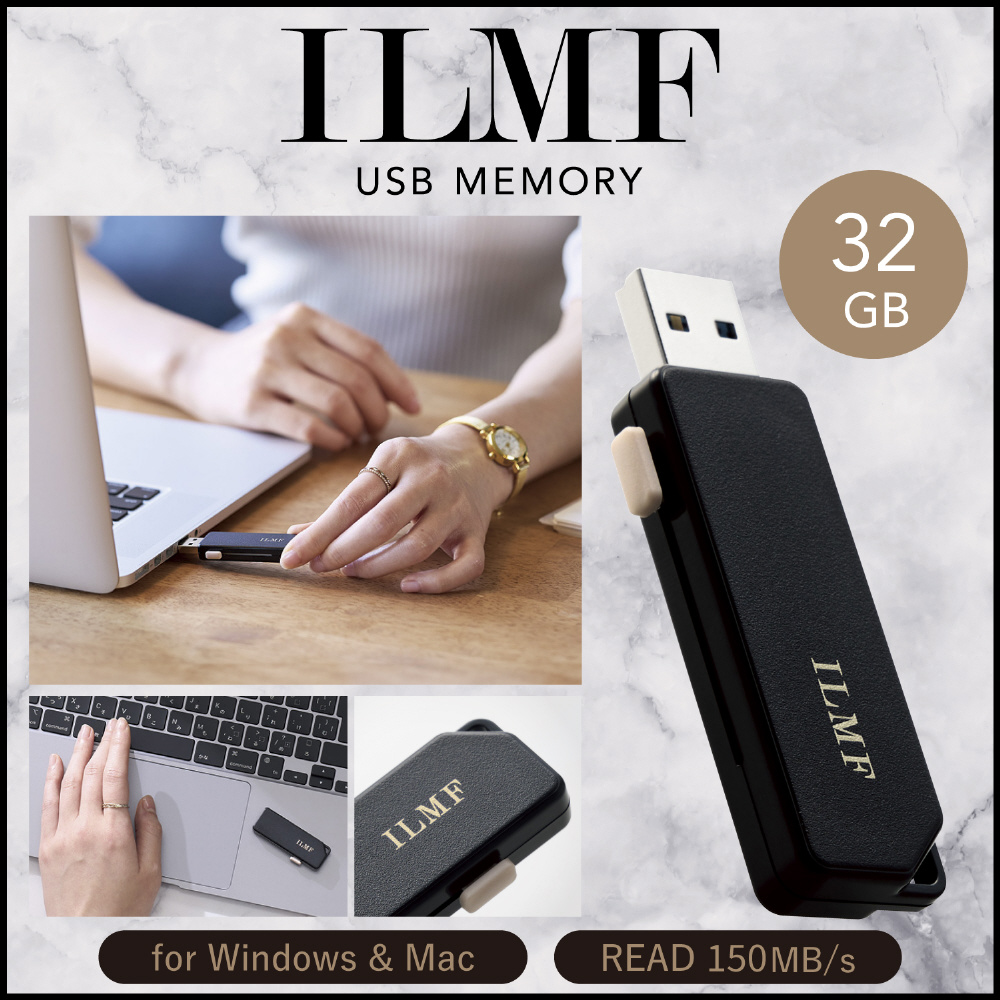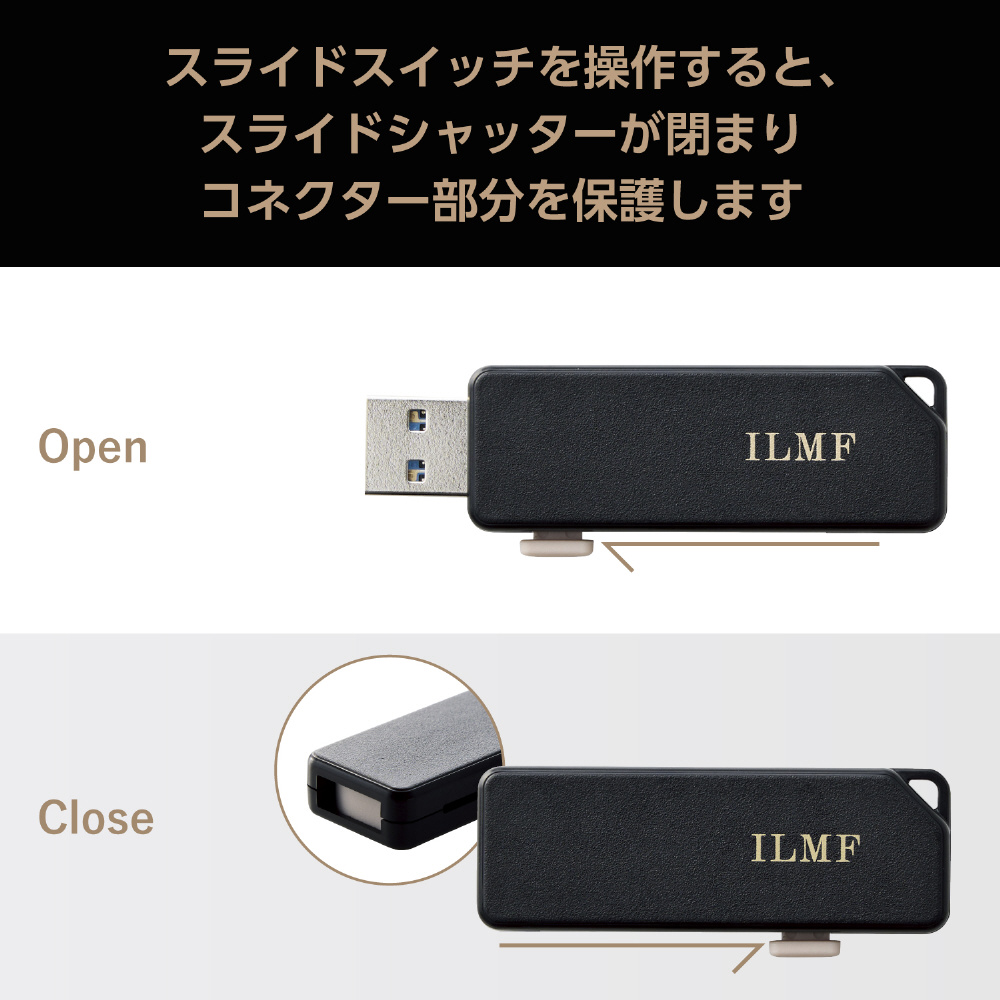 スライドシャッターで、コネクターを保護。先端をしっかり守って、キャップをなくす心配もなし。私らしい仕事道具で毎日をもっと輝かせる、“ILMF”シリーズのUSB 5Gbps(USB3.2(Gen1))対応スライドシャッター式USBメモリです。