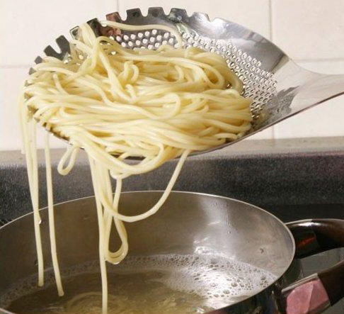 フチ周囲のデコボコ歯がツルツルパスタをしっかりキャッチします。湯上げタイミングを逃さない家族サイズ。直径3mmの穴を開けた独自の設計により、抜群の水切れを実現。