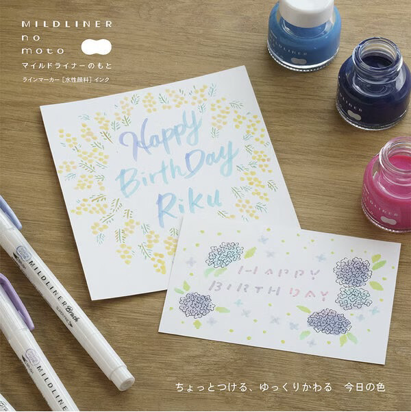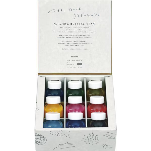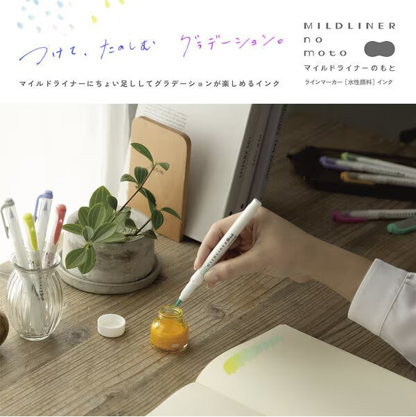 【数量限定】ゼブラは、これまでマッキーやサラサなどの筆記具を製造販売していましたが、このたび初めてペンで使われているインクを販売します。今回販売するインクは、おだやかな色合いが人気のラインマーカー「マイルドライナー」のインクです。ペンと違う色のインクにペン先を直接つけることで、自分だけの表現を楽しむことができます。