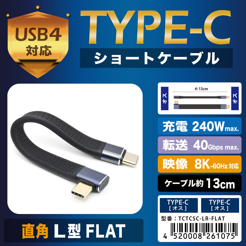 本製品は、USB4対応 TYPE-C to TYPE-Cケーブルで、ストレート、直角、垂直、延長に対応した6種類のショートケーブルです。