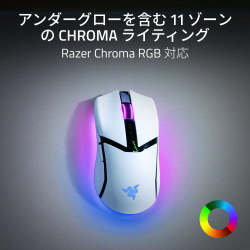 Razer Chroma RGB 対応ワイヤレスゲーミングマウス、Razer Cobra Pro でライバルを圧倒し、魅了しましょう。Razer HyperSpeed Wireless と個別プログラム可能な 11 個のライティングゾーンでプレイを彩りながら、優れた没入感により極めて自由にプレイを楽しむことができます。