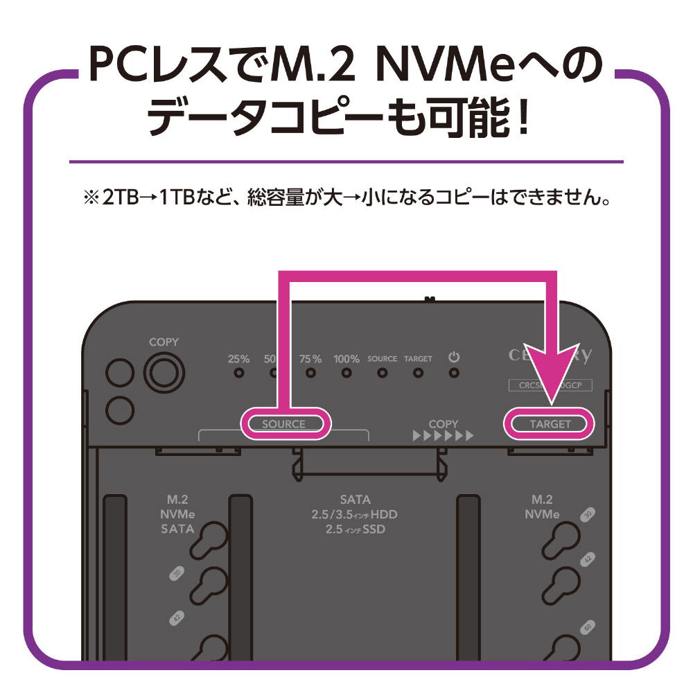 M.2 SSD、SATA HDD/SSD、どれでも接続可能! M.2 NVMe SSDへのクローン機能も搭載した外付けクレードル