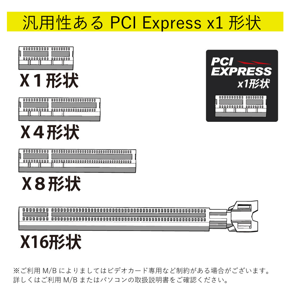 本製品は汎用性に優れるPCI Express x1 に対応しております。もっとも多くのマザーボードに搭載しており、加えて、PCIE×4、×8、×16でも使用が可能です。