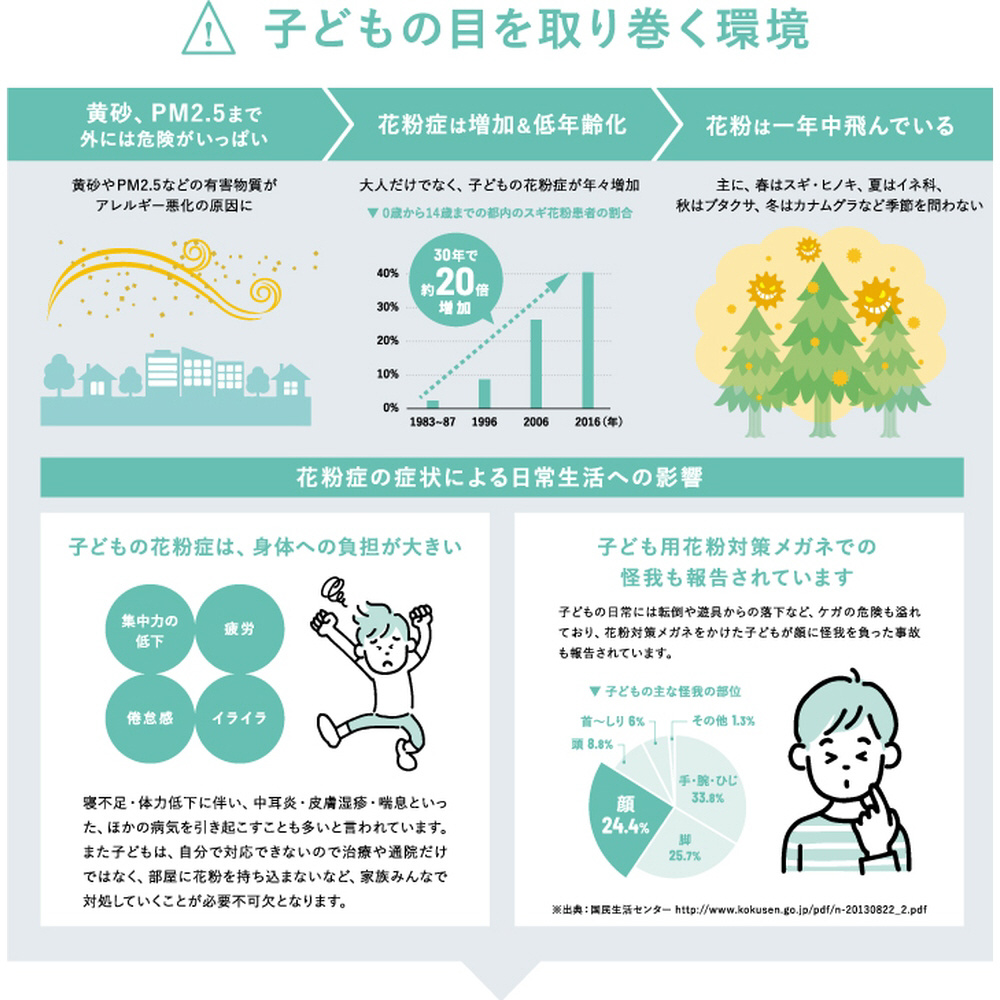 柔らか素材のクッションサイドガードが顔に優しくフィットし、花粉・ホコリなどの外部刺激からお子様の目を守ります。