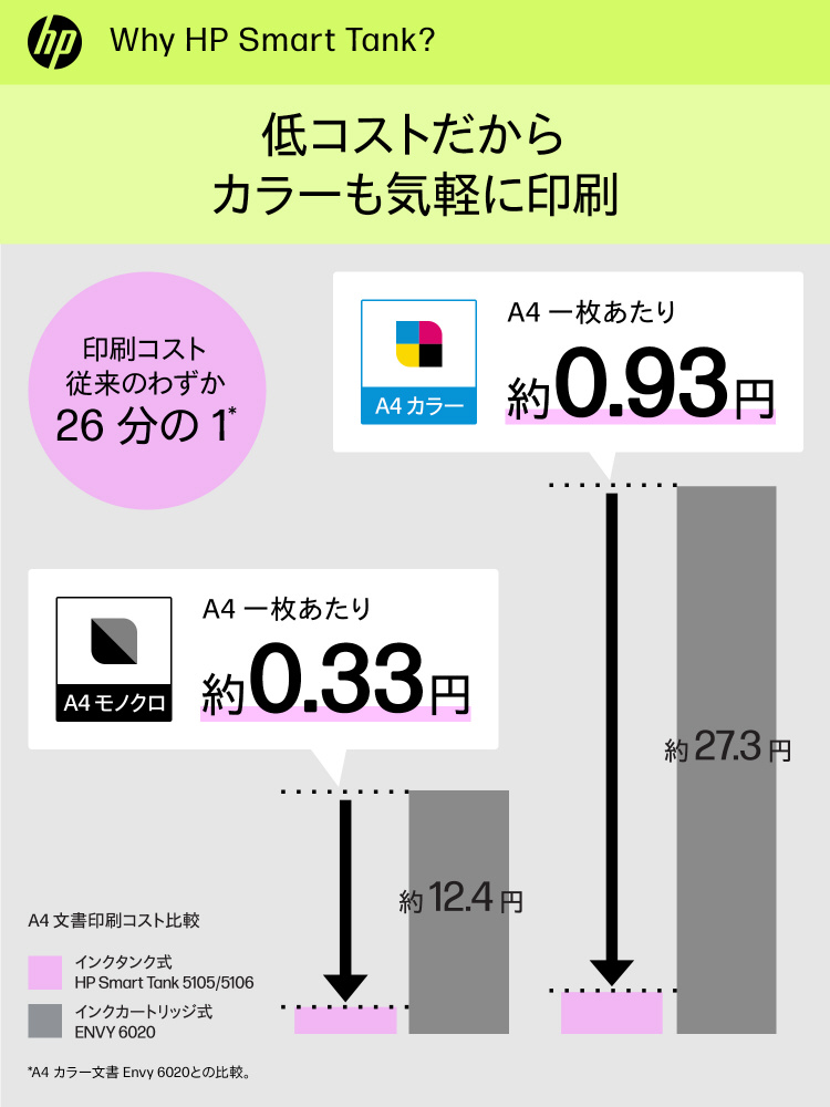 A4カラー文書1枚当たりの印刷コストはモノクロ約0.33円・カラー約0.93円、驚きの低コストを実現します。黒インクは顔料インク採用で、水に濡れてもにじみにくいので、文書もくっきりキレイ。カラーは染料インクで鮮やかなカラーを実現します。
