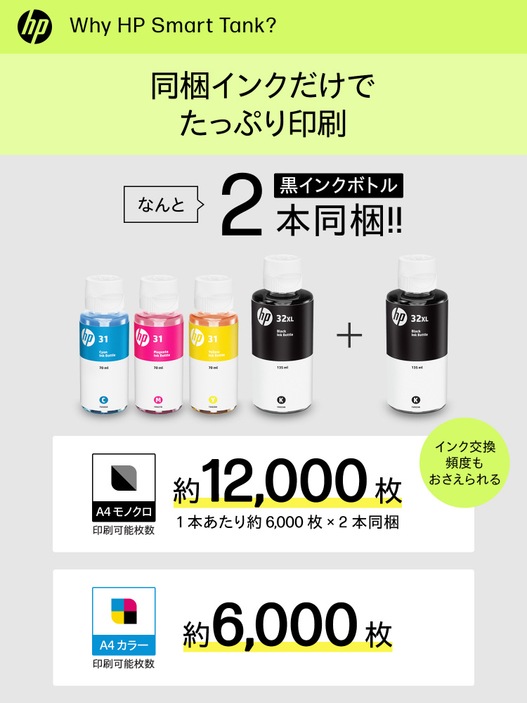 同梱インクボトルでA4モノクロ12,000枚/A4カラー6,000枚の印刷が可能です。最初の同梱インクは、顔料黒インク×2本・カラーボトル各色×1(シアン・マゼンタ・イエロー 計3本)の合計5本のボトルがついてきます。