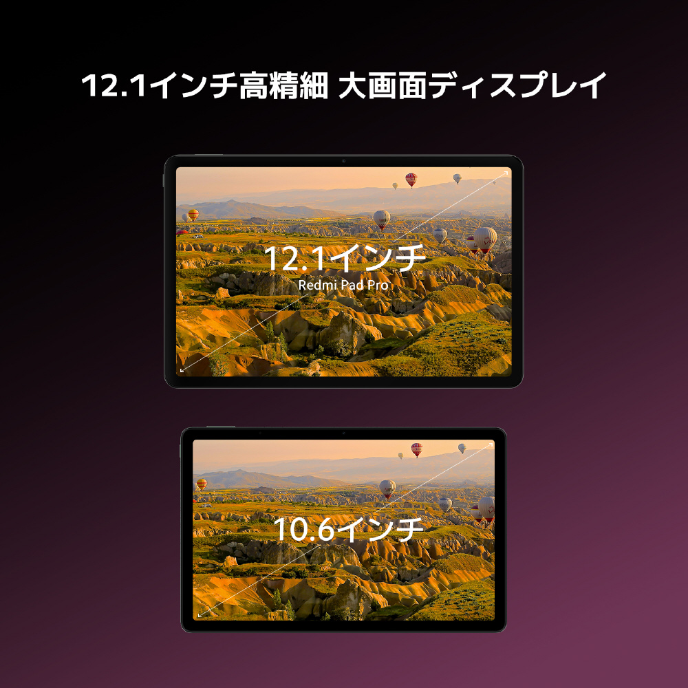 *Redmi Pad Proの画面サイズは、対角線の長さを測定すると約12.1インチです。角が曲線状のため、表示可能な領域が小さくなります。個々の製品によって、測定値は異なることがあります。