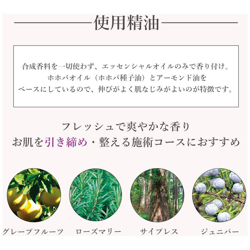 ホホバ種子油、アーモンド油、コムギ胚芽油、グレープフルーツ果皮油*、ローズマリー葉油*、イタリアイトスギ葉/実/茎油*、セイヨウネズ果実油*、トコフェロール