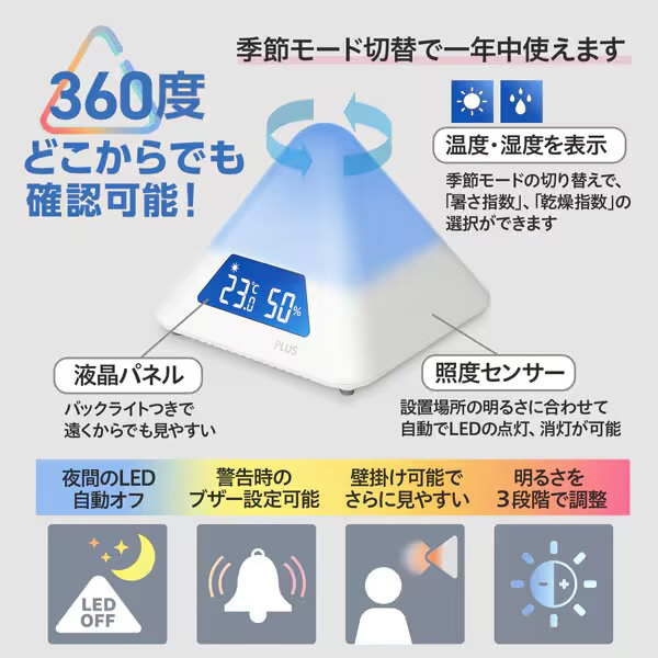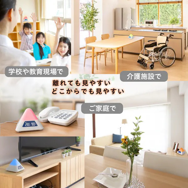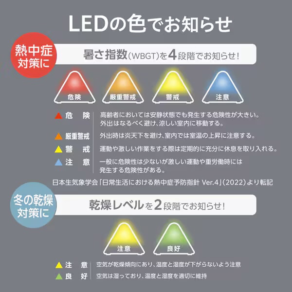 夏場の熱中症による病院への救急搬送者が増加し、社会問題にもなっています。本製品は、日本生気象学会が作成・公表している日射がない室内を対象とした暑さ指数(WBGT)の簡易推定図「日常生活における熱中症予防指針 Ver.4, 2022」に準拠し、熱中症の危険度を色でお知らせします。