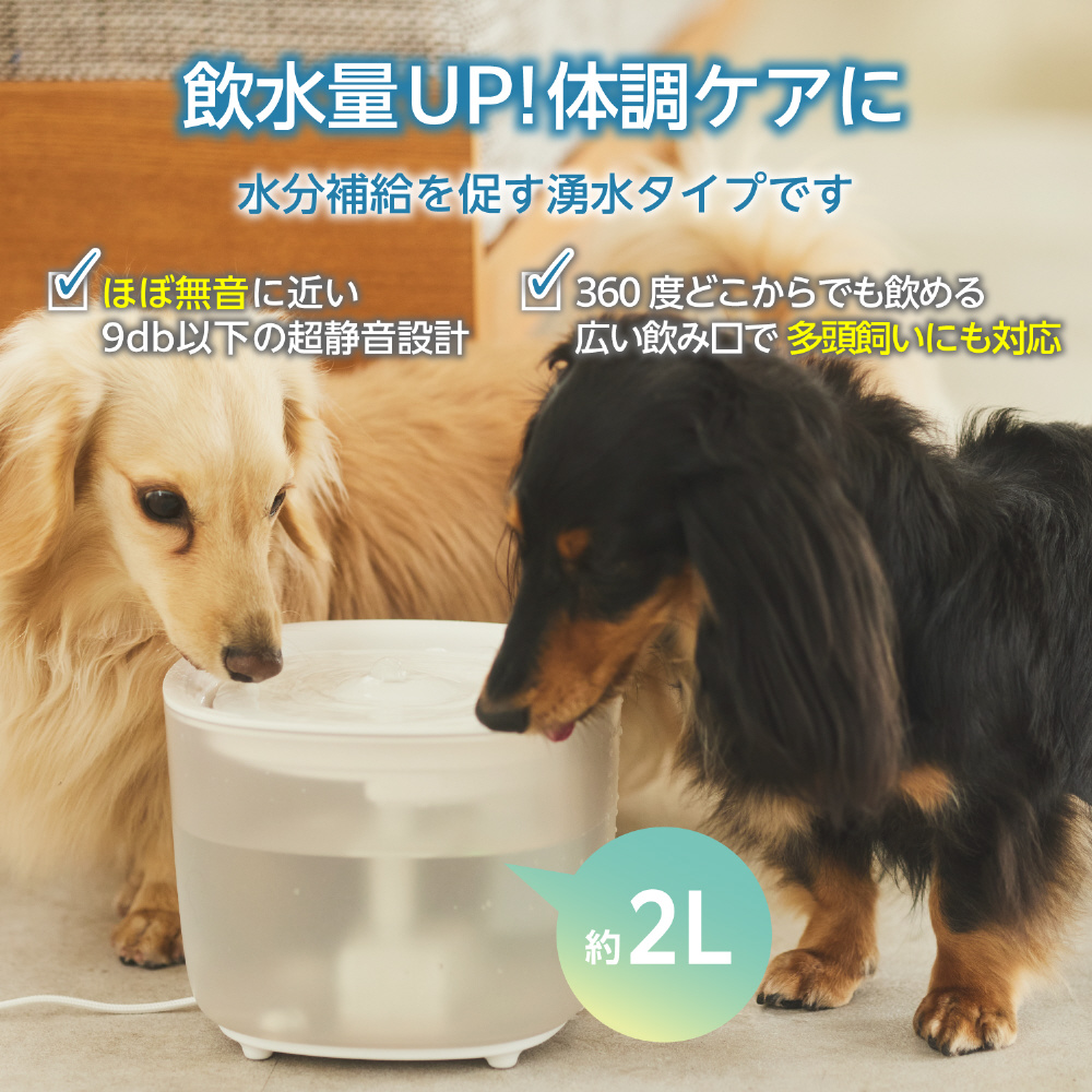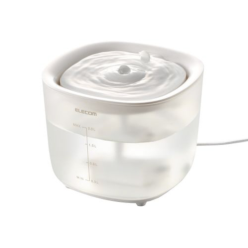 トレイ中央からポコポコと水が湧き出る湧水タイプです。穏やかな水流でひげに水が当たりにくく、360度どこからでも飲める広い飲み口で多頭飼いにも対応しています。