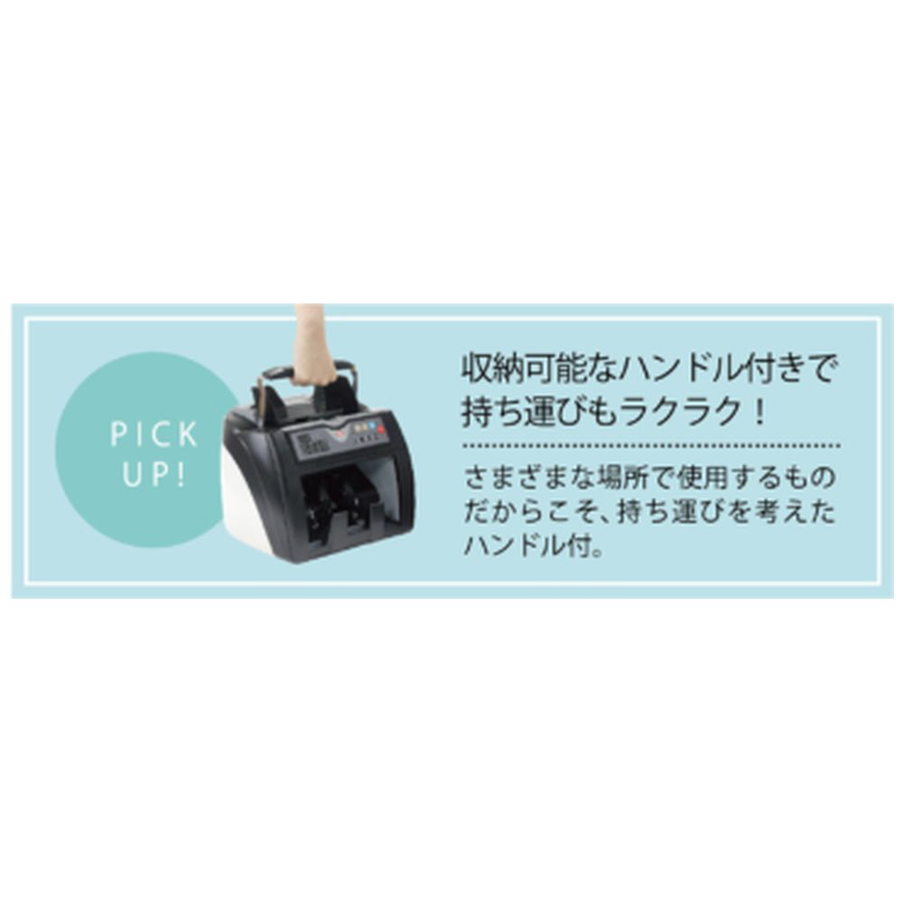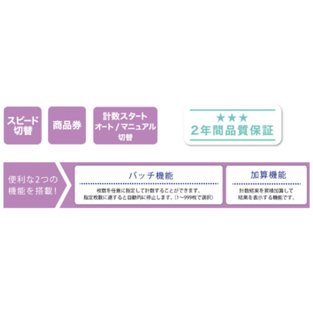 仕様1 | [計数対象]日本銀行券4金種、投票用紙(※)、商品券、ビール券等 ※BPコート紙(128×80mm・厚さ0.1mm・薄色)に適します。 [計数可能サイズ]縦50〜90mm 横110〜175mm [計数速度]1500枚・1200枚・800枚/分 (3段階切替) [ホッパー容量]300枚 [スタッカー容量]220枚 [機能]加算機能、バッチ機能:1〜999の任意設定 |