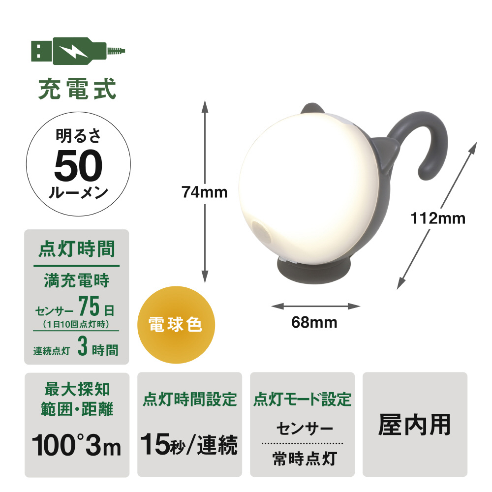 充電式 まんまるねこちゃんセンサーライト グレー WAM052-GR [LED /昼白色]