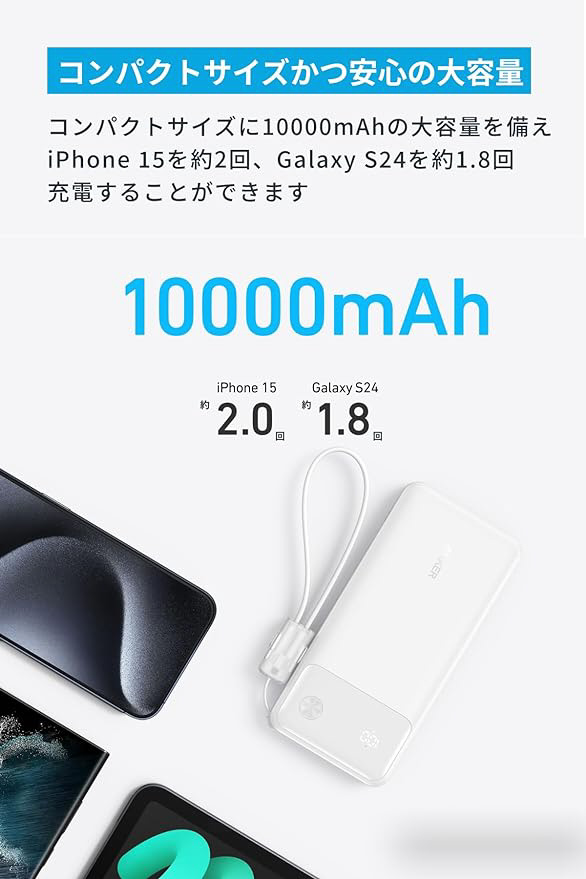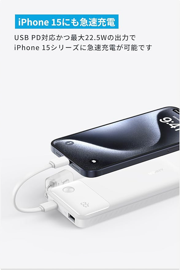 モバイルバッテリー Power Bank (10000mAh、22.5W、2 Ports) ホワイト A1388N21 [USB Power Delivery対応 /2ポート]