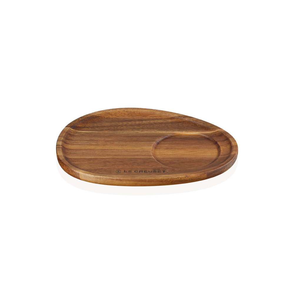 マグやボールをのせられるくぼみがある、アシンメトリーな楕円型のアカシア製ウッドトレイ。
