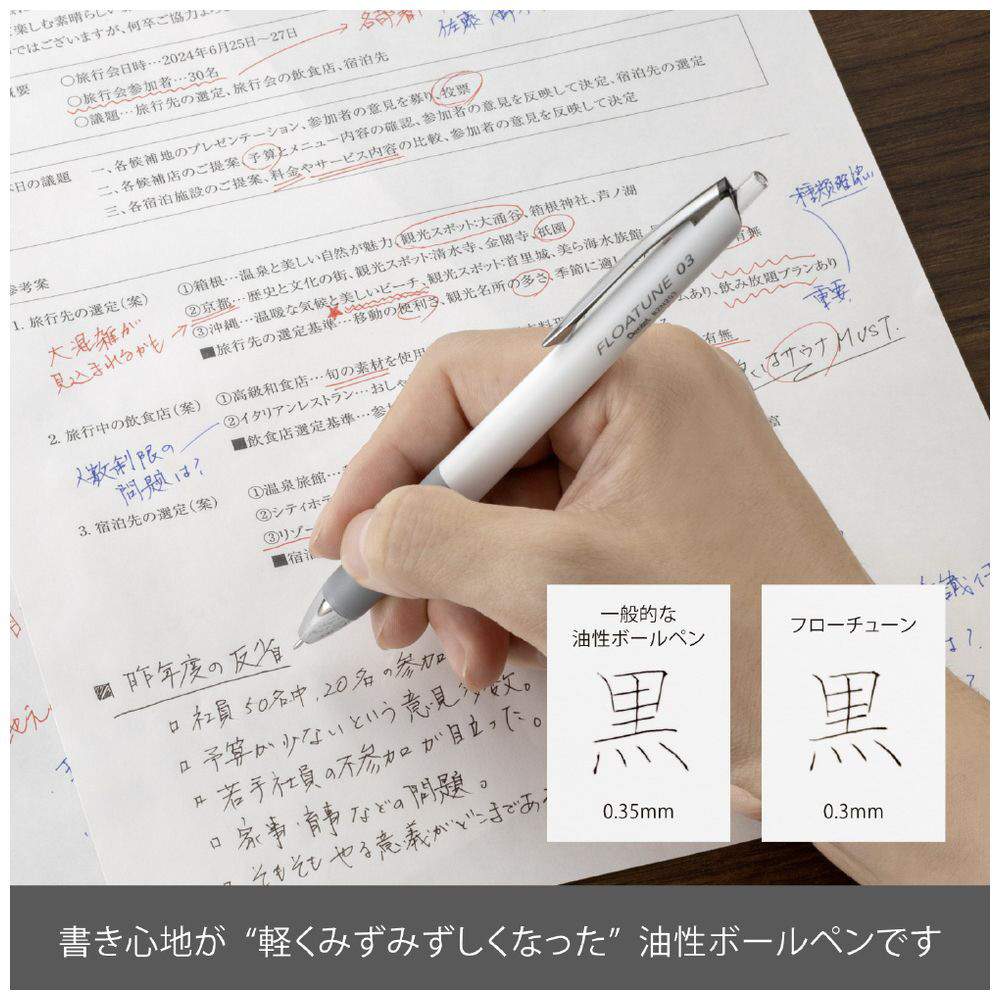 フローチューンは、油性でありながらゲルのような書き心地の良さも兼ね備えた新感覚「摩擦レス」の新油性ボールペンです。軽い筆記感と心地よさを追求した新開発の油性インキボールペンです。・筆記時の摩擦を極限まで軽減した、摩擦レスボールペン・クッション性の高いスムーズなインキ・ストレスのない書きごこちを体現した、ノイズレスなデザイン。