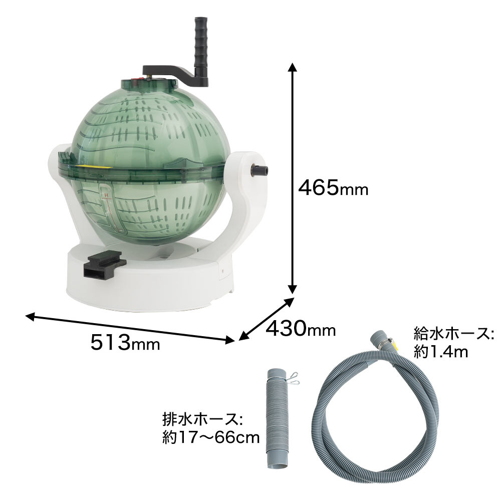 | 付属品 | 本体(土台、下半球)、上半球、固定スタンド、ハンドル、給水ホース、排水ホース |
