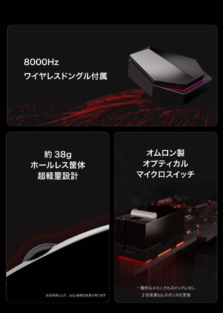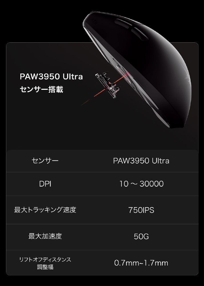 F1 ULTIMATEは、わずか約38gの超軽量ワイヤレスゲーミングマウスです。穴がなく滑らかで握りやすいフォルムにサイドボタンを2つ搭載し、最大42000DPIまで調節可能なPAW3950Ultraセンサーを採用。オムロン製オプティカルマイクロスイッチにより、抜群の反応速度と耐久性を実現しています。付属のワイヤレスドングルで有線無線を問わず最大8000Hzの高ポーリングレートに対応します。