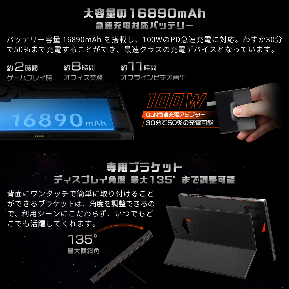 ポータブルゲーミングPCモード・ノートブックモード・そしてパームタブレットモードと自由自在に切り替えが可能。