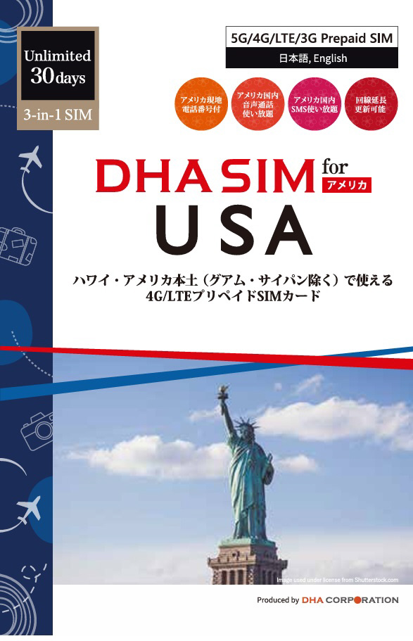 DHA SIM for USA アメリカ 30日無制限プリペイド 音声データ SIMカード 5G/4G/LTE回線 DHA-SIM-167 [マルチSIM /SMS対応]