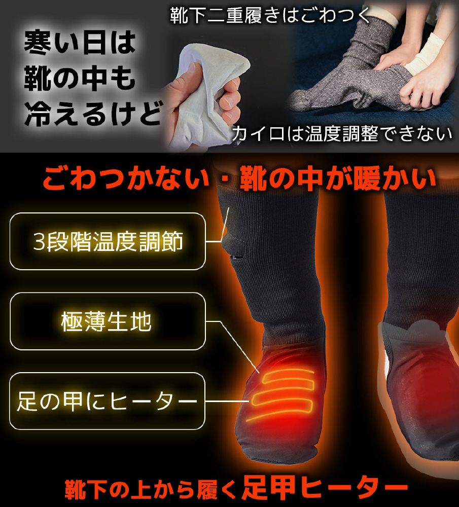 ●足の甲を暖める、靴下の上に履くごわつかない超薄型ヒーター靴下