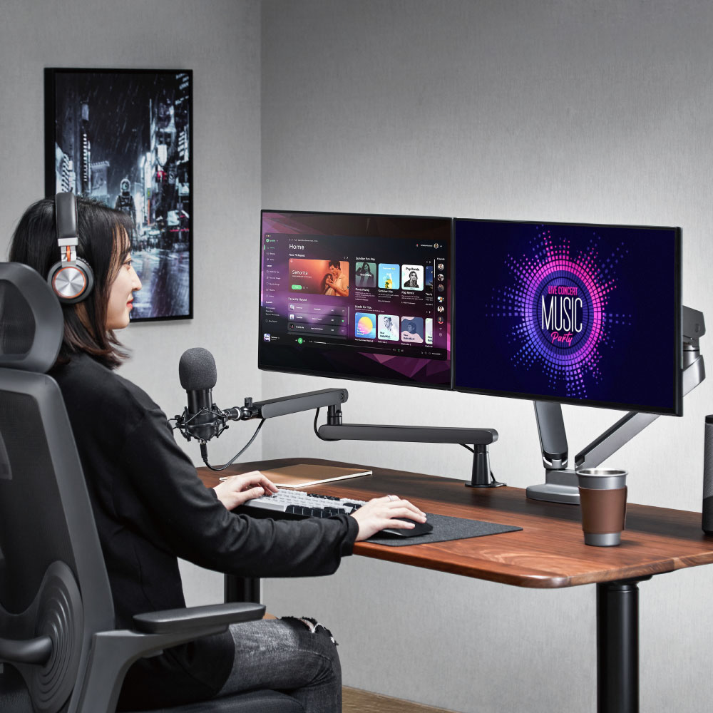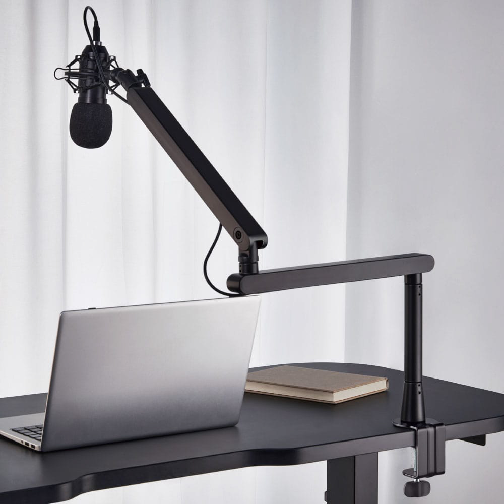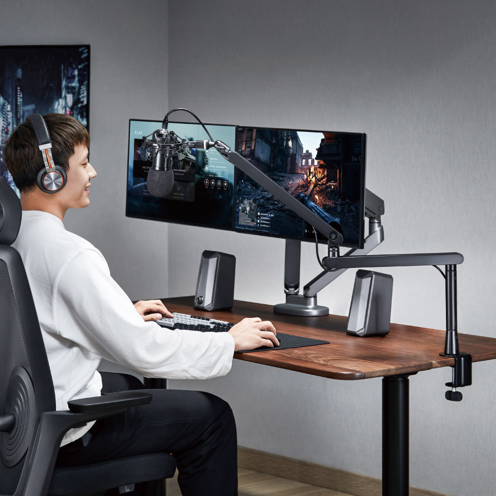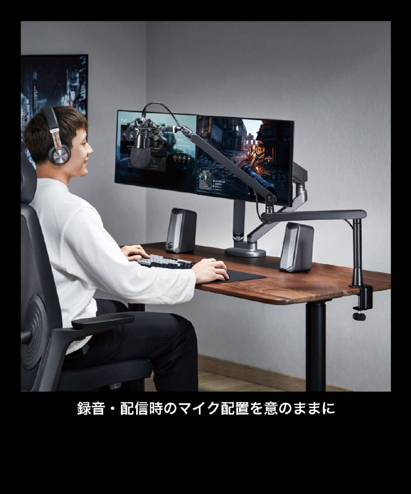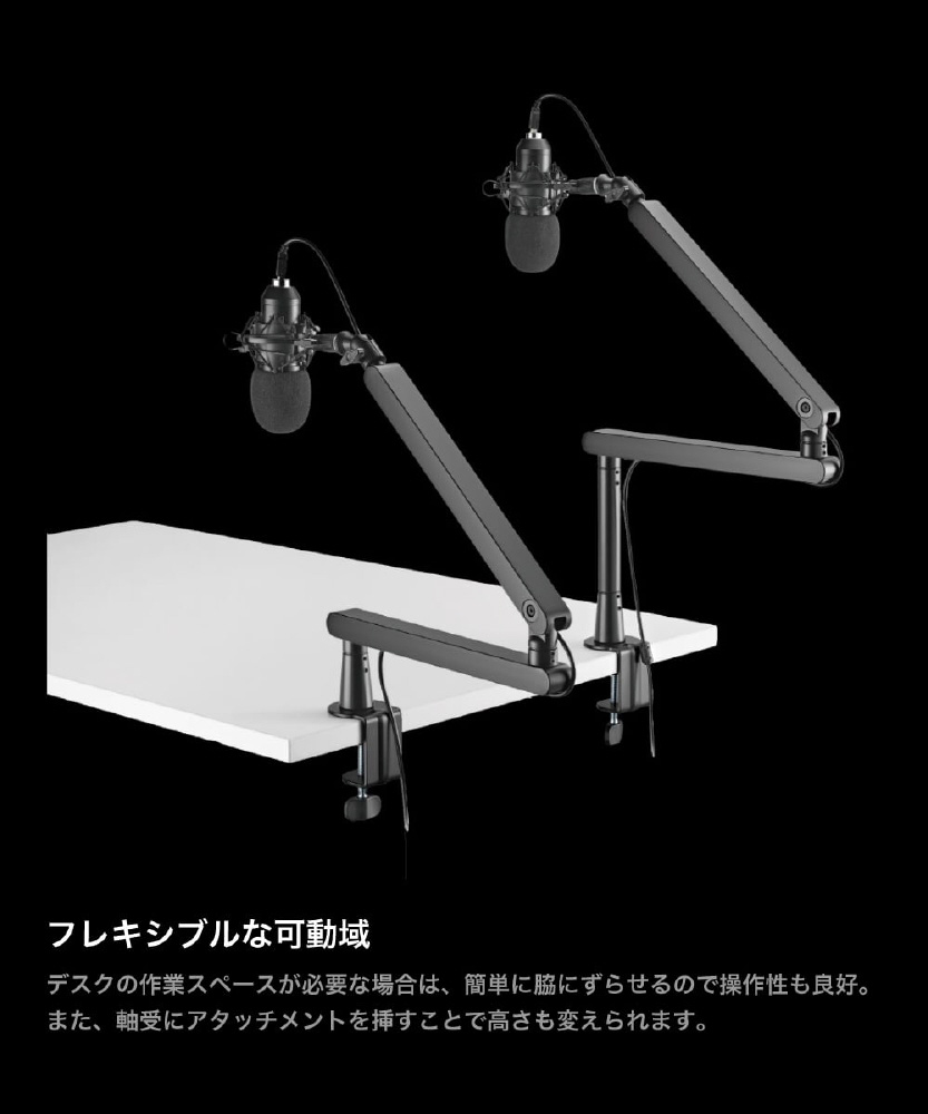 ユーザーの肩より下の低い位置に固定できるので、画面の視界を遮られたくない方におすすめ。モニター下からアームを出し、ユーザーの正面にストレス無くマイクを向けることも可能。