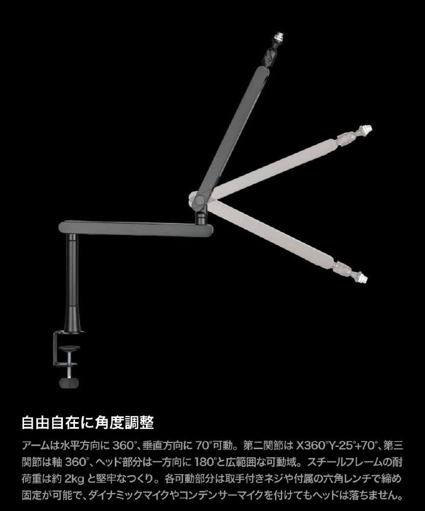 【クランプ固定式で関節の自由度が高いスチールフレームマイクアーム】
