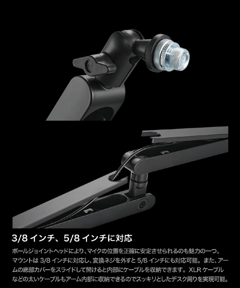 XLRケーブルなどの太いケーブルもアーム内部に収納できるので、スッキリとしたデスク周りを実現可能。