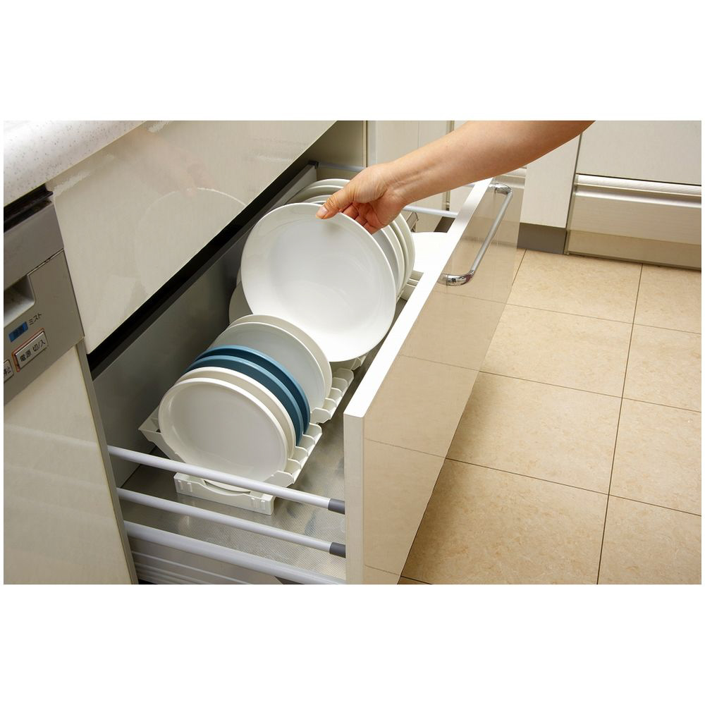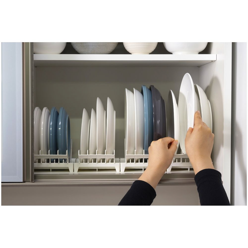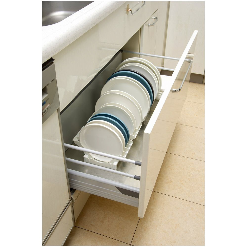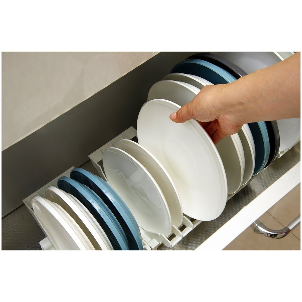 直径18〜26cm、高さ4cm以下の皿を立てて収納できます。
