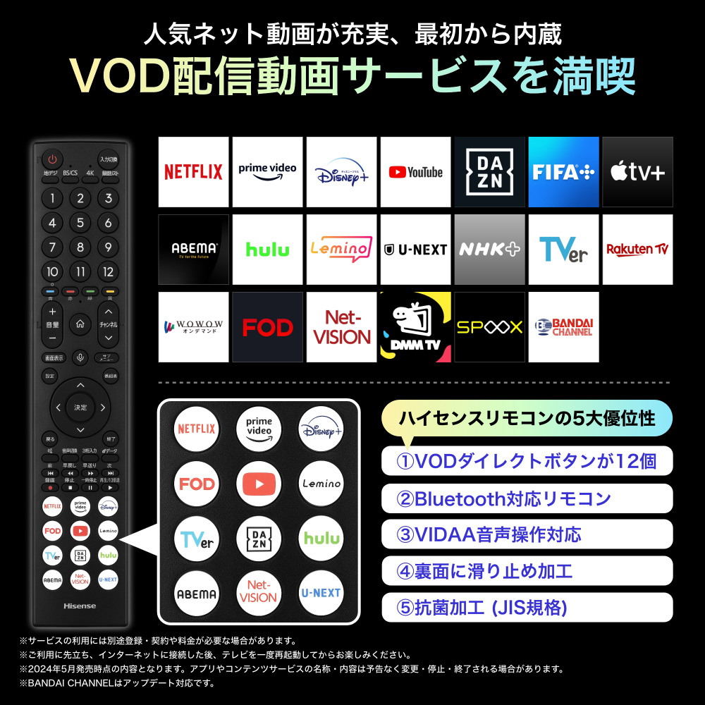 | 商品名 | 液晶テレビ 100U7N [100V型 /Bluetooth対応 /4K対応 /BS・CS 4Kチューナー内蔵 /YouTube対応] 【要事前見積もり】 |