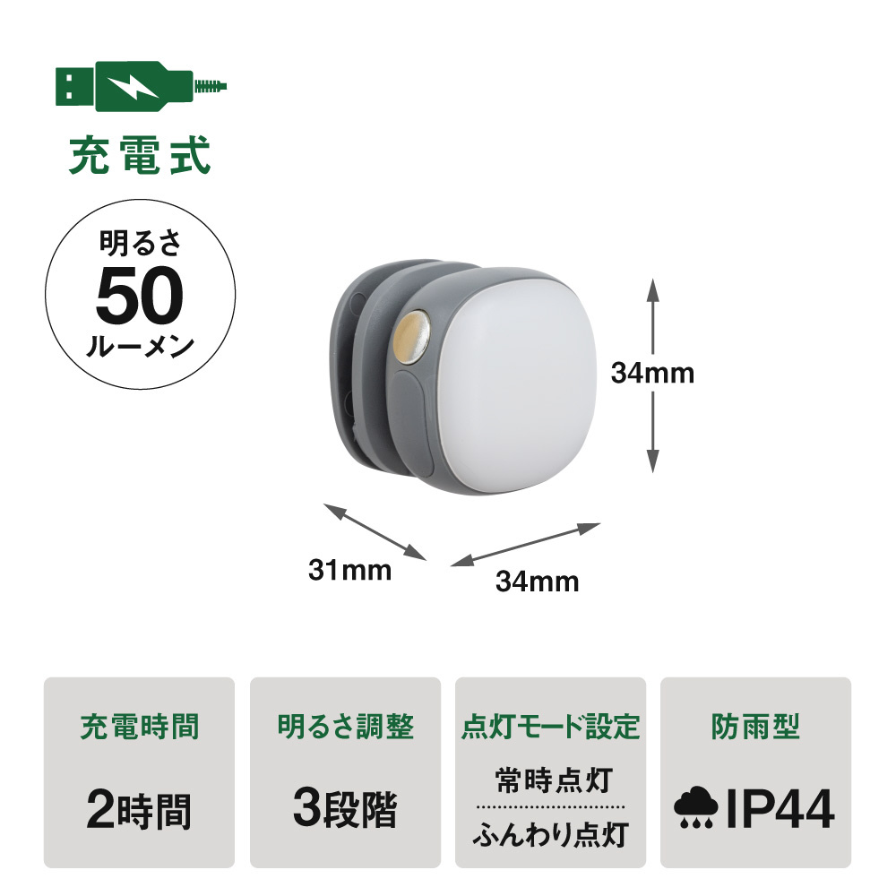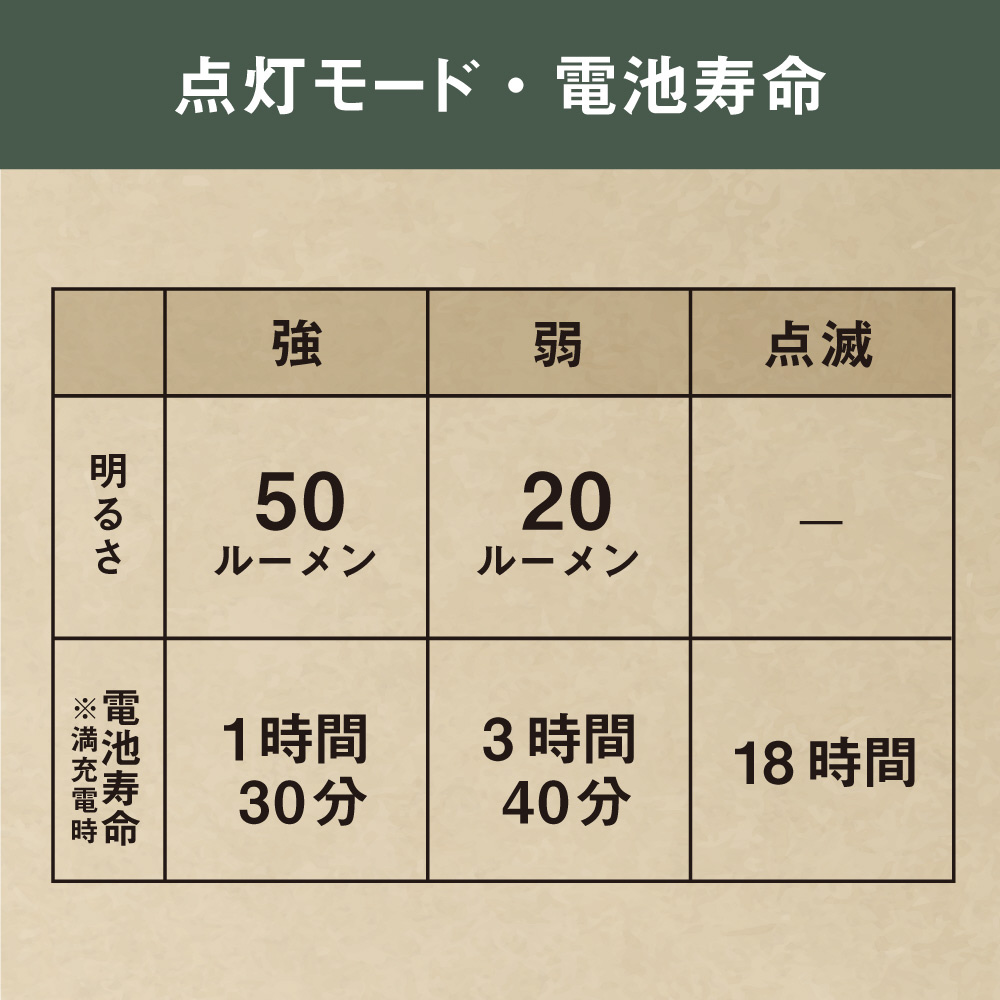 明るさは50ルーメン(強)、20ルーメン(弱)、点滅の切り替えが可能です。