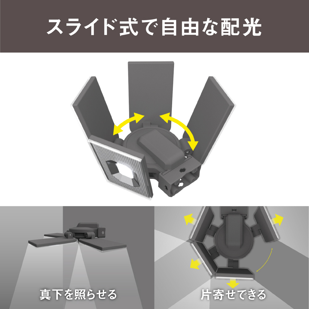ライト部がスライド式で照射方向が自由に調節できます。真下を照らしたり、ライトを片側に寄せて照らすことも自由自在。
