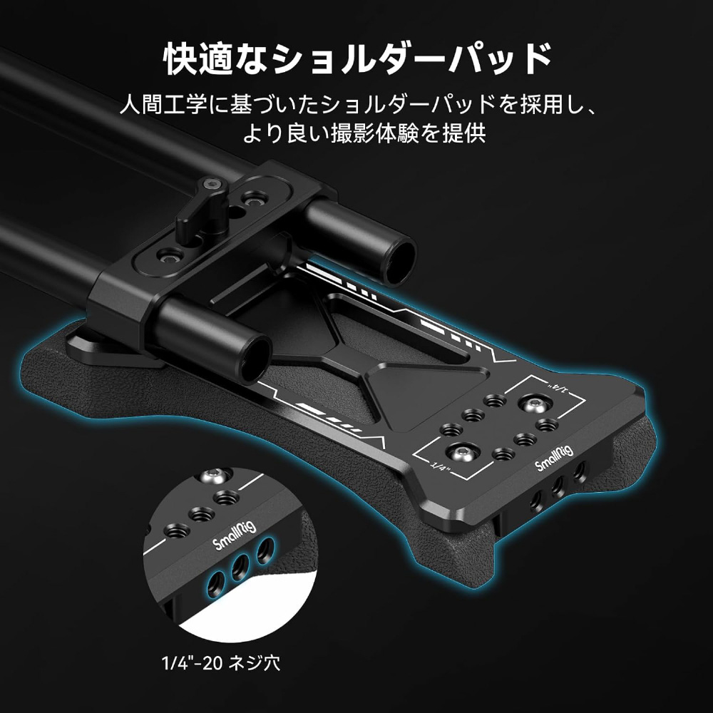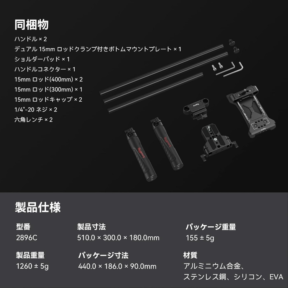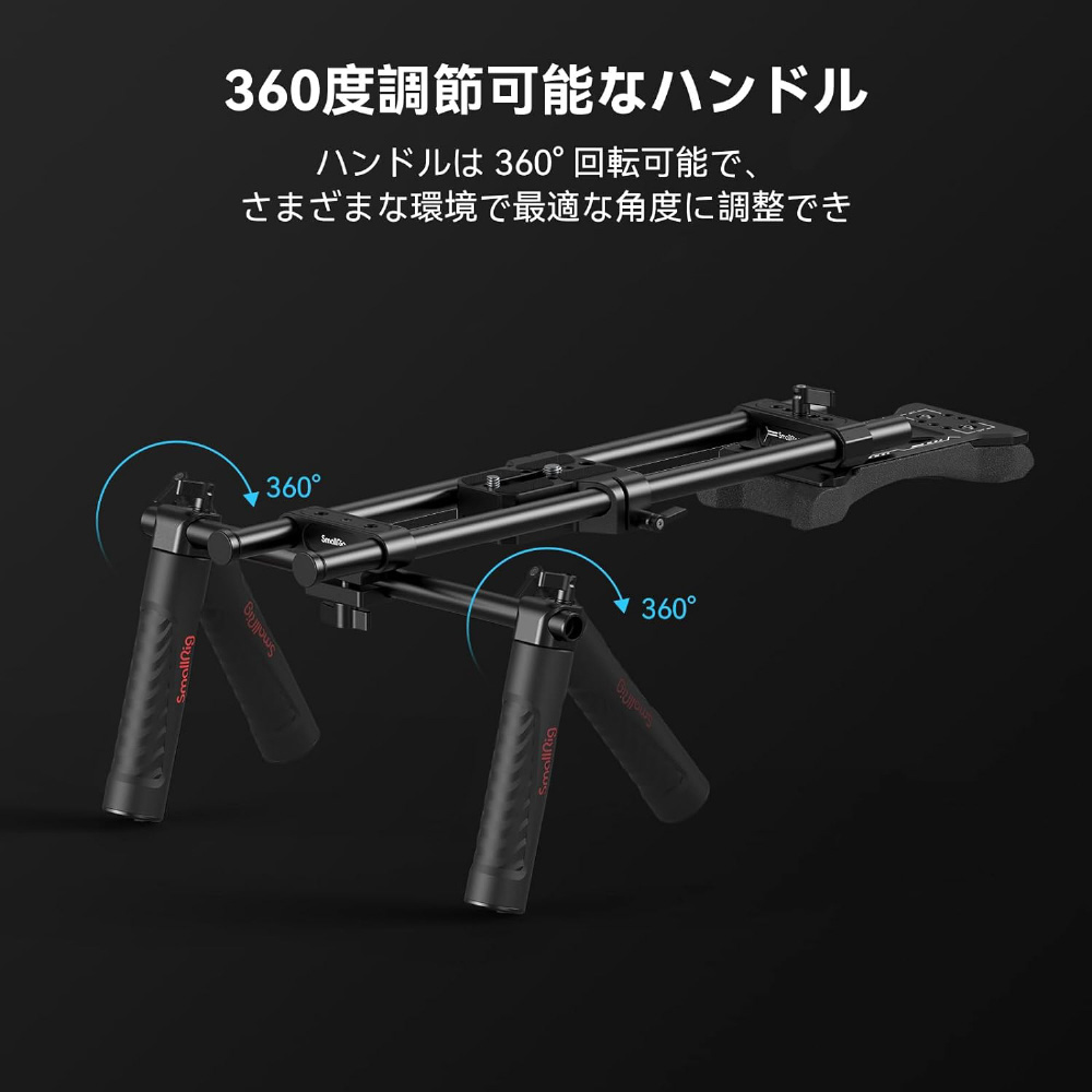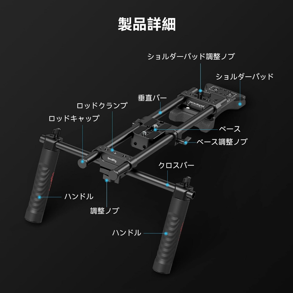 主な特長 ・様々なカメラに対応し、互換性が高い ・ノブ一つでハンドルの脱着や位置調整ができ、便利 ・ハンドルは様々な位置や角度に調整でき、柔軟性が高い ・クッション材にEVAスポンジ素材を採用し、肩の疲れや痛みを軽減 ・多数の1/4インチネジ穴を備え、可能性を広げる ※ご注意 当該商品と使用する際に、フォローフォーカスやマットボックスなどを装着できない可能性が御座います。 互換性 汎用