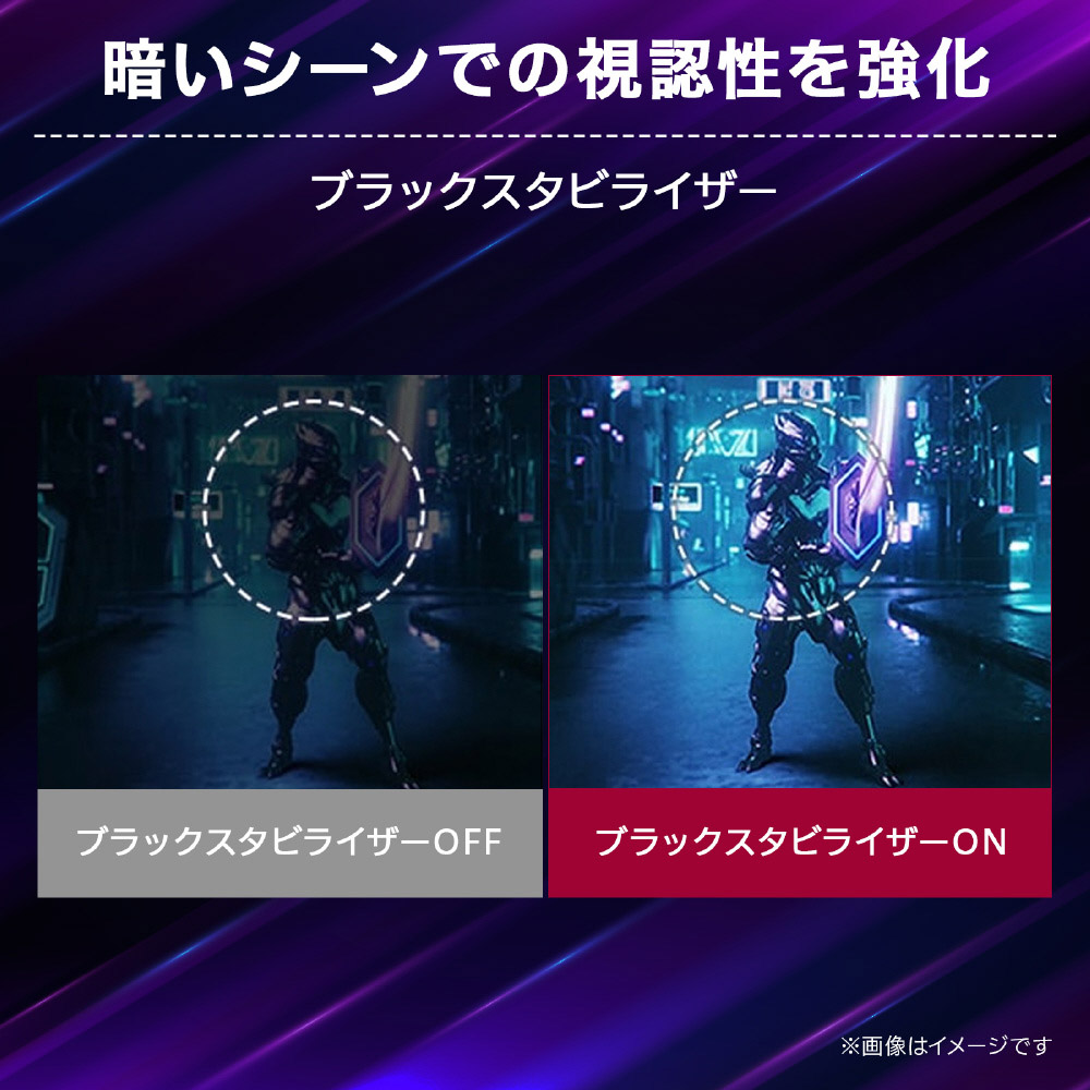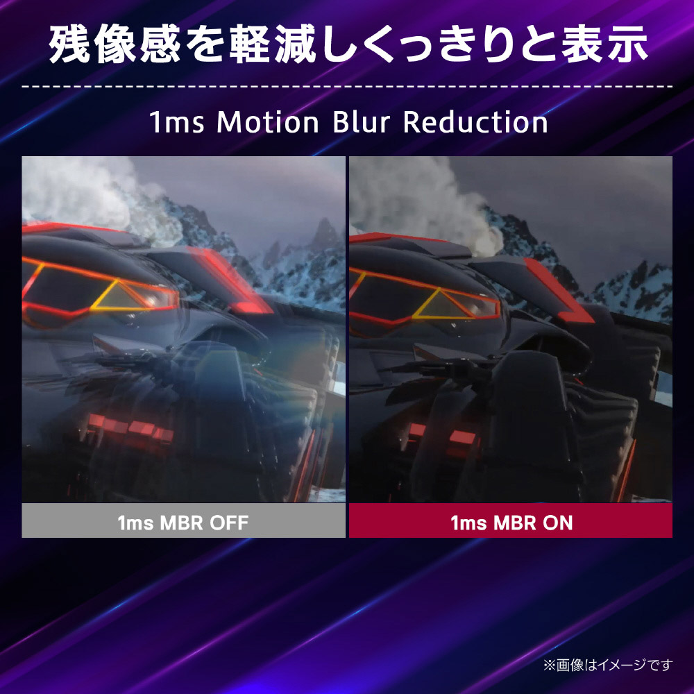 映像のコマが切り替わる際に、バックライトのオンオフで残像感を軽減する「1ms Motion Blur Reduction」で、くっきりとした映像を映し出します。高速な動きによる映像のぼやけを軽減することで、よりターゲットの動きが見やすくなります。