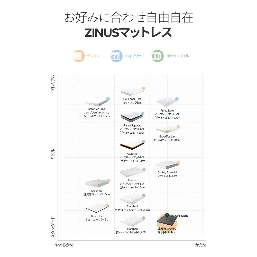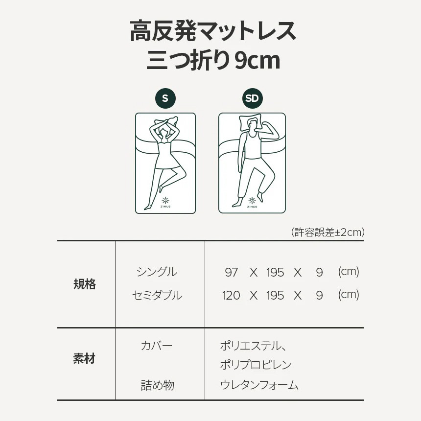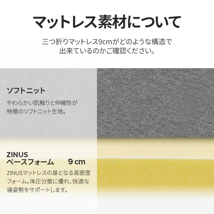 3つ折りマットレス【Tri-Fold】シリーズ・厚さ9cm仕様(高反発)。
