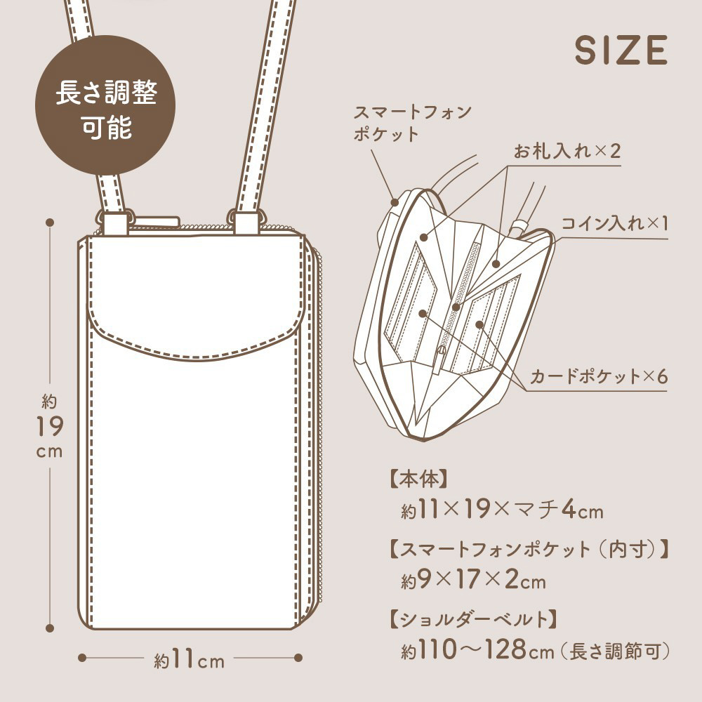| 仕様1 | 商品サイズ:本体:(約)11×19+マチ4cm(ベルト部含まず)、スマートフォンポケット(内側寸法):(約)9×17×2cm、ショルダーベルト:(約)全長110〜128cm(調整可) |