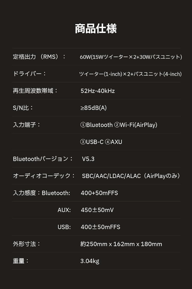 | 仕様1 | Bluetooth USB-C AUX Wi-Fi(AirPlay時) |
