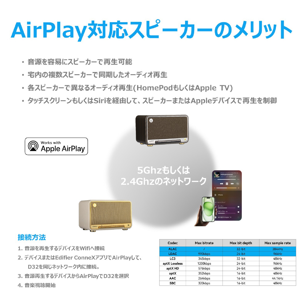 Apple Airplay2に対応しているのでAppleデバイスと合わせて使用することでより高音質で快適な使用感を得られます。Apple製デバイスから音楽を本機(D32)に流して、それを家の中の別の場所にあるD32(他のAirPlay対応スピーカーも可) と同期させることさえできます。※「AirPlay」とは、同じWi-Fiネットワーク内のスピーカーやテレビ(など)に、iPhone や iPad の映像や音楽を無線で送り表示することができる技術です。